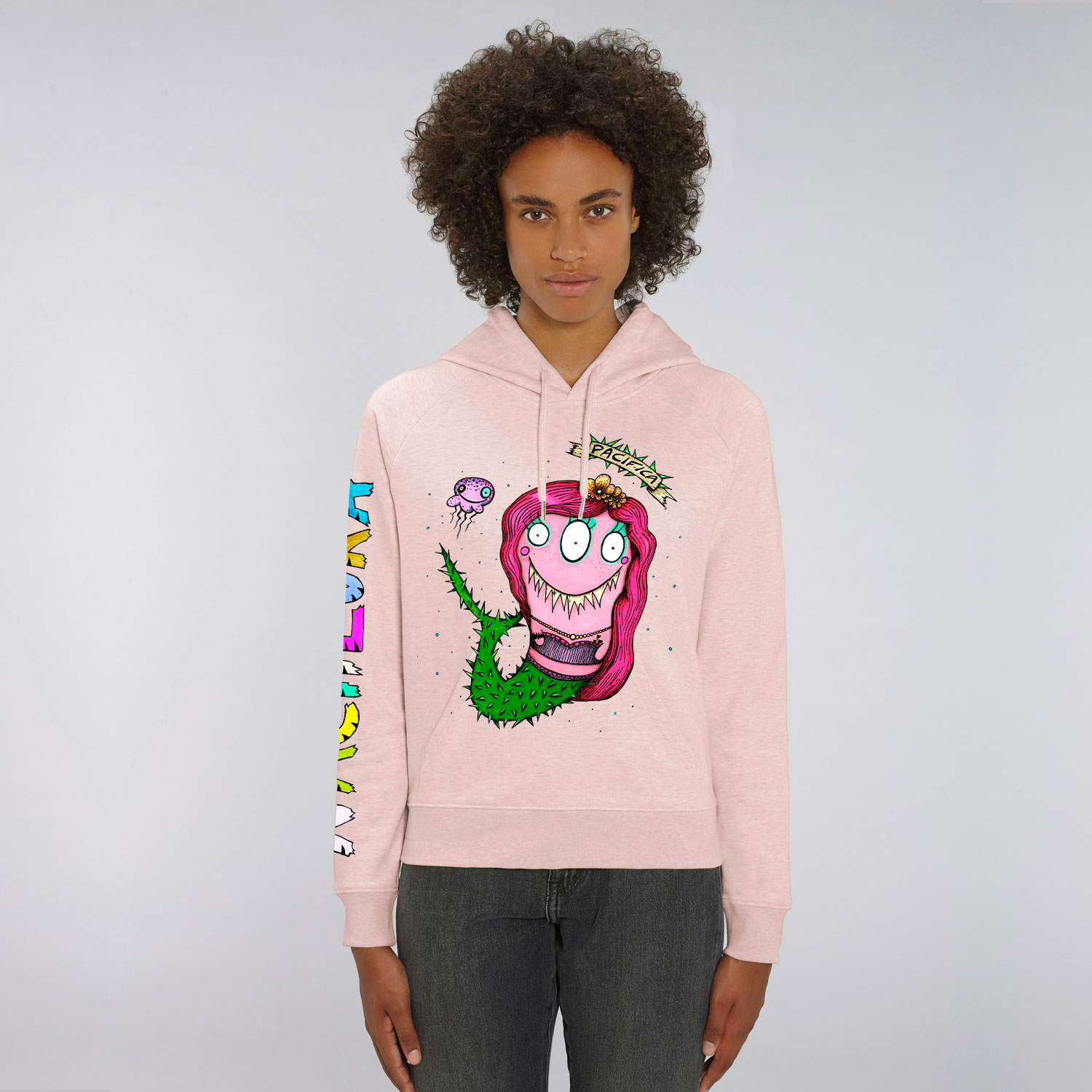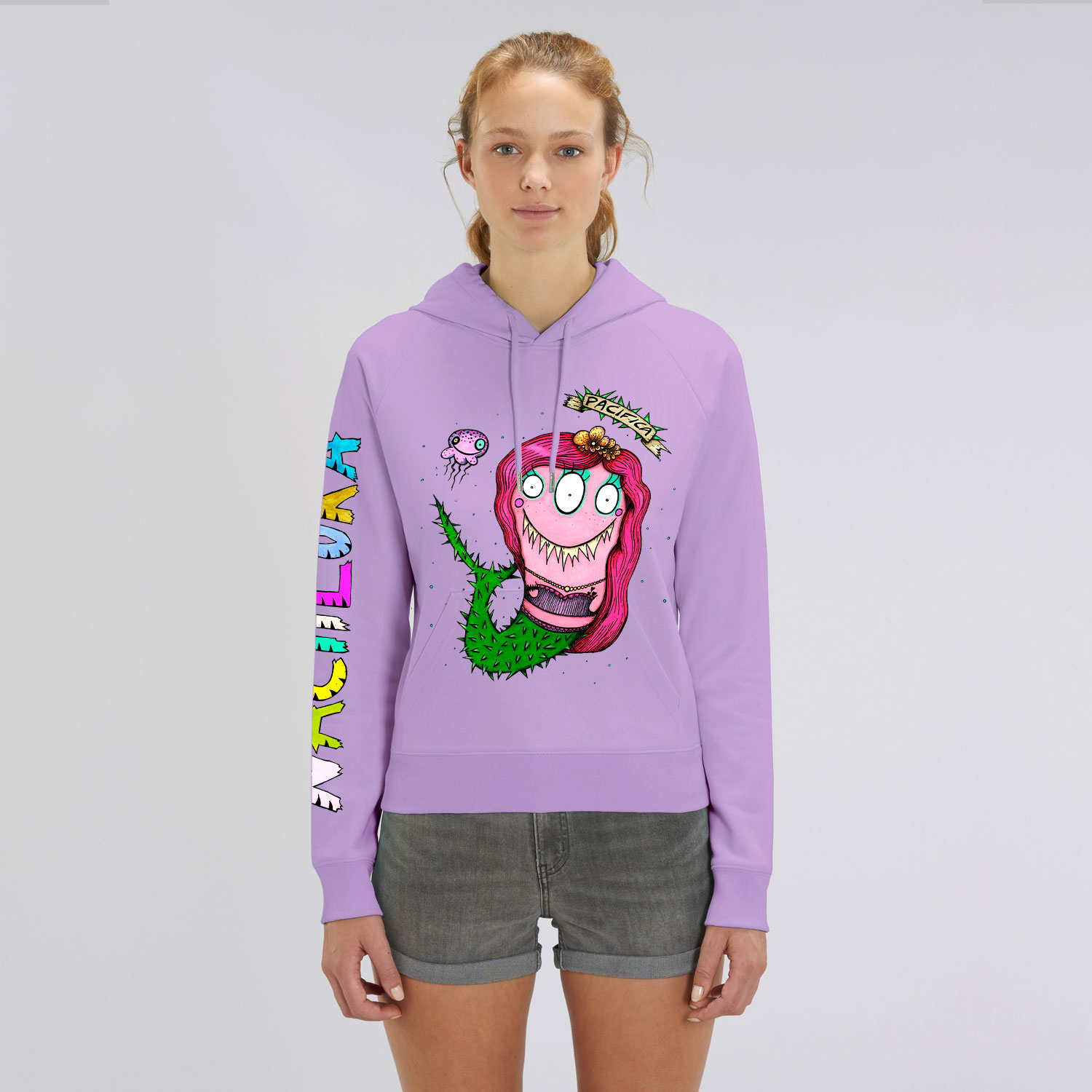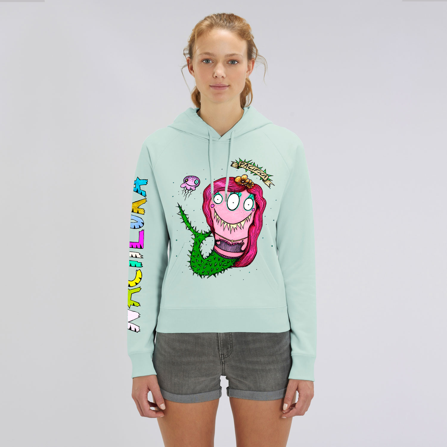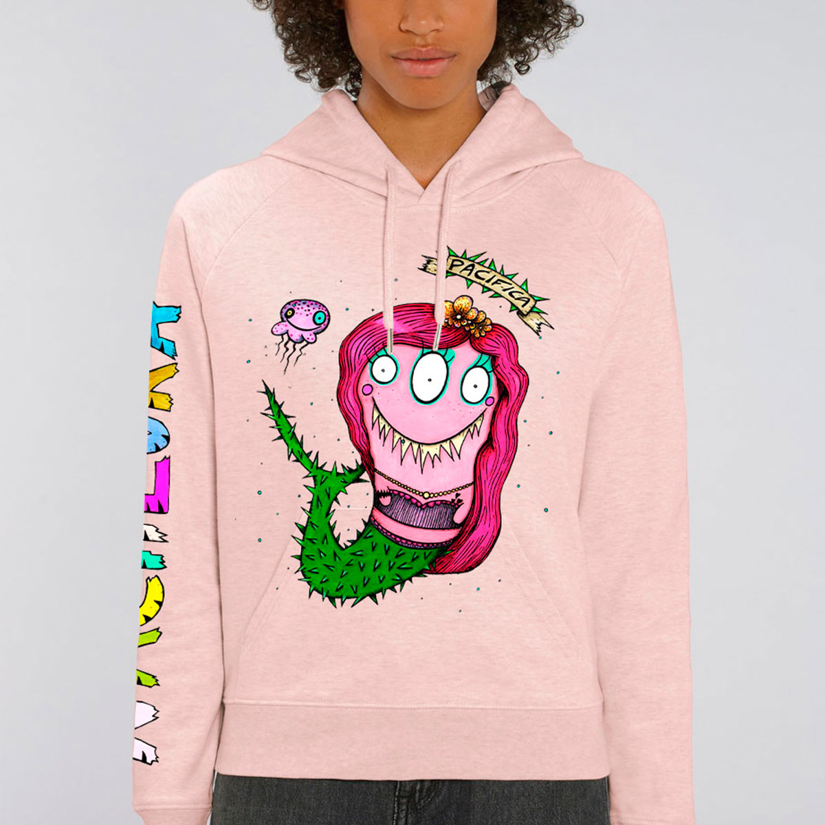 Sudadera de mujer con el dibujo SIRENA PACÍFICA realizada con algodón orgánico.